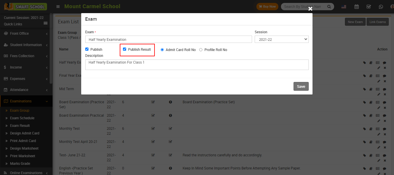 To publish Examination result after enter students exam marks you should click on edit exam button and here enable Publish Result option and then save it so your created exam result will be published and visible to students at Exam Result page.