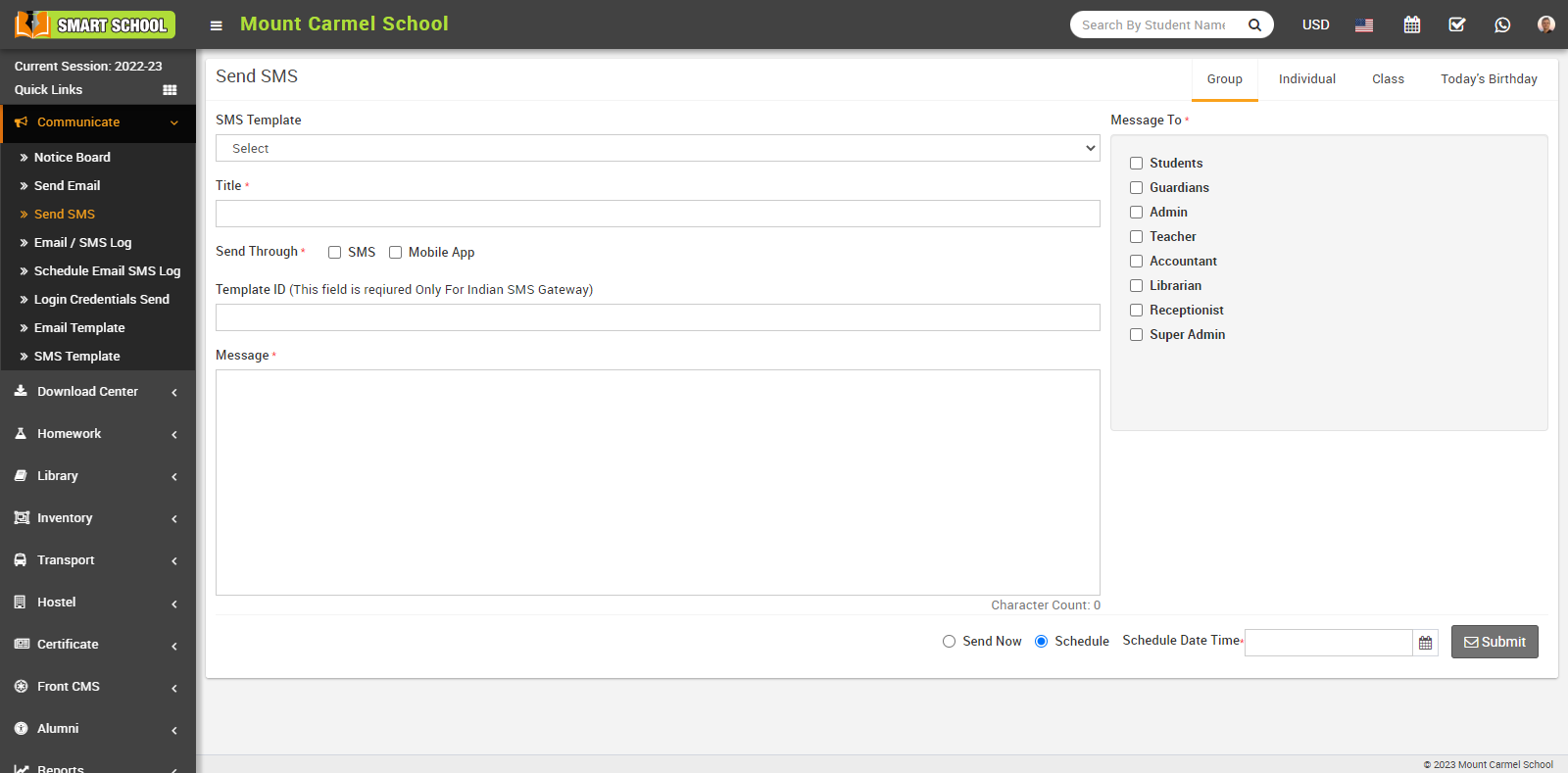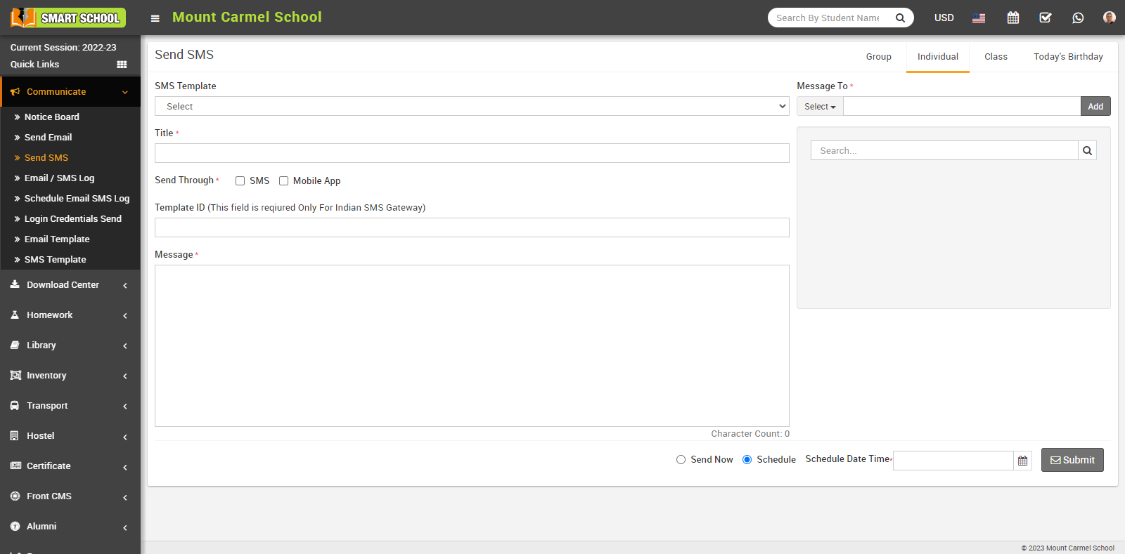 To send SMS individual, click on the Individual tab present at top right corner of the page then enter the details message SMS Template, Title, Send Through, Message and select Message To (Select the group of the person to whome you want to send email and then search for the member name in the textbox and to add more students click on the add button) and then click on Send or Schdule button and click on submit button