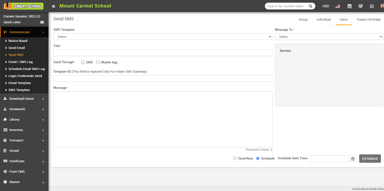 To send SMS class, click on the Class tab then enter the details message SMS Template, Title, Attachment, Message and select Message To and Section (Here you can select multiple sections) and click on Send or Schdule button and click on submit button.