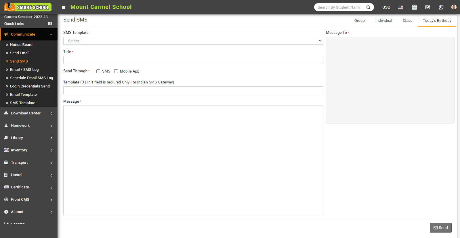 To send SMS today's birthday, click on the Today's Birthday tab present at top right corner of the page then enter the details message SMS Template, Title, Send Through, Message and Message To and click on Send or Schdule button and click on submit button.