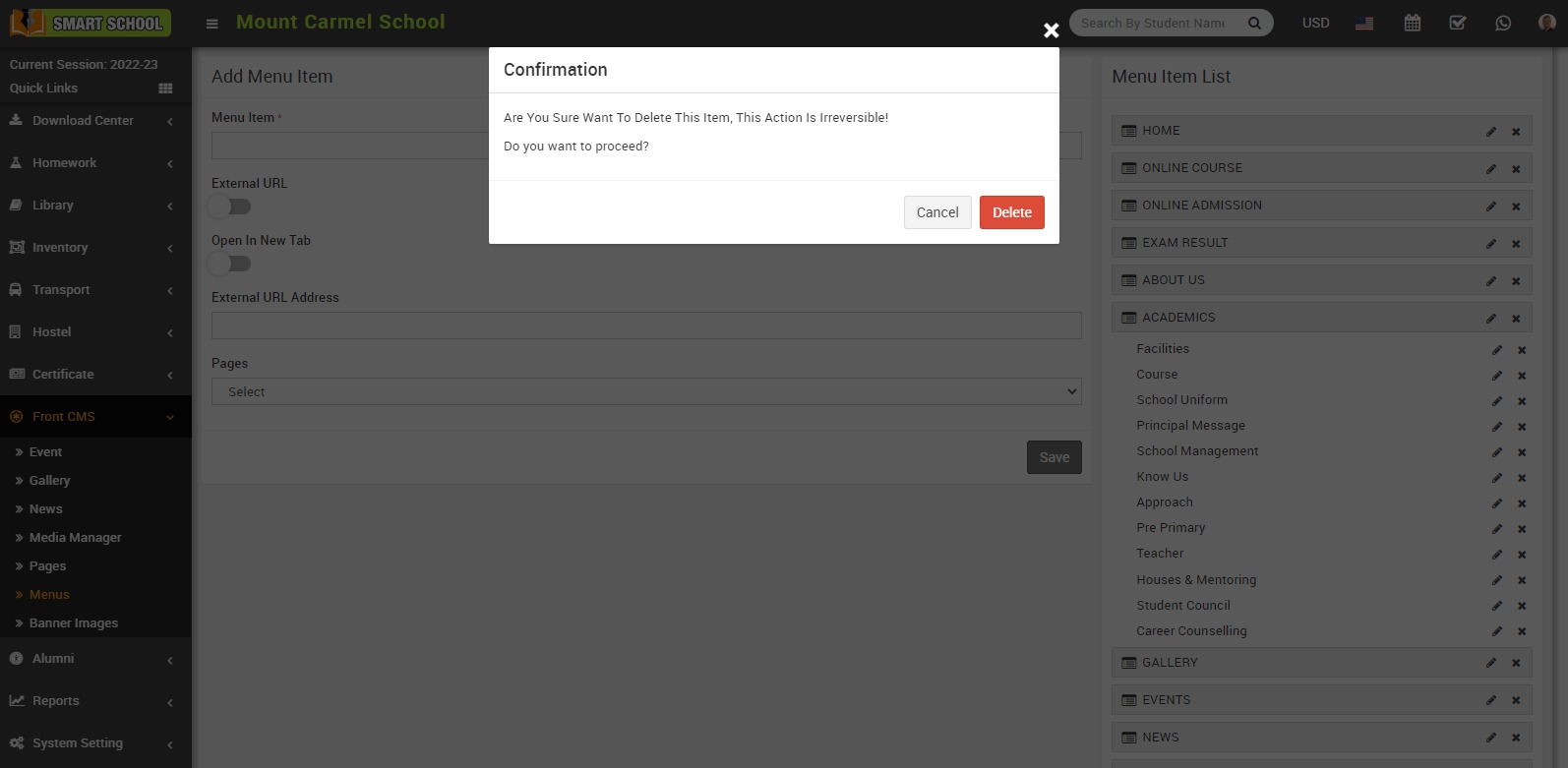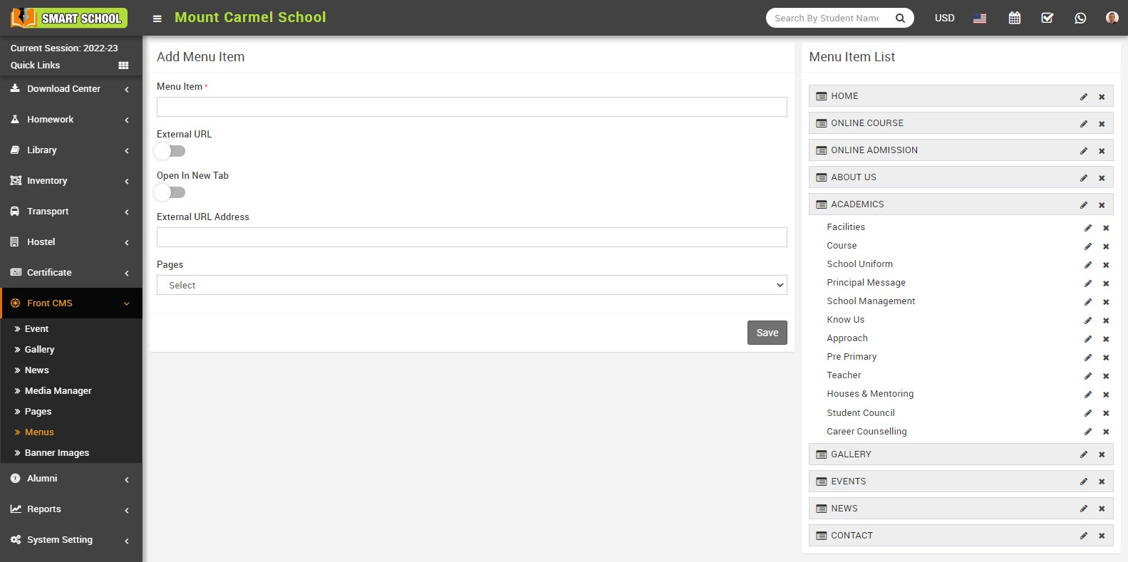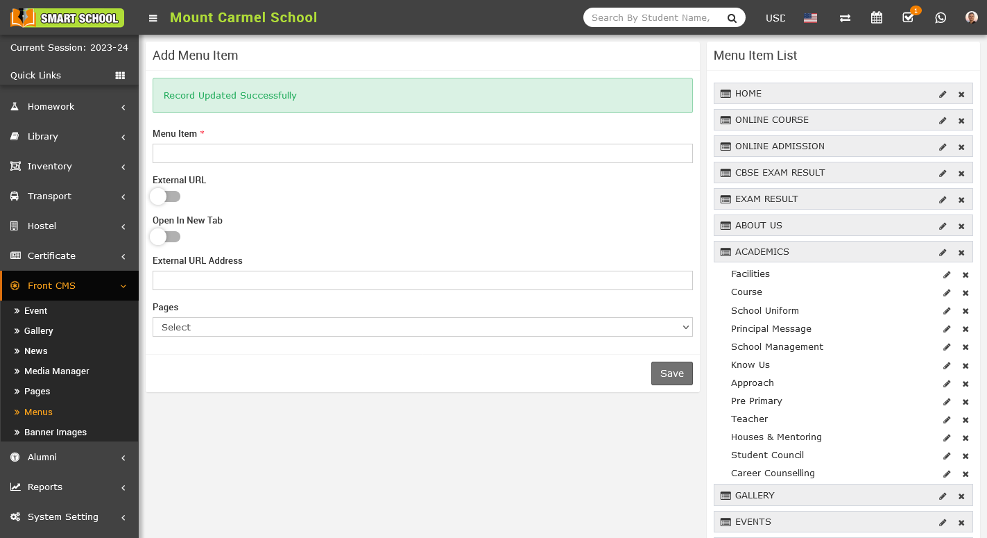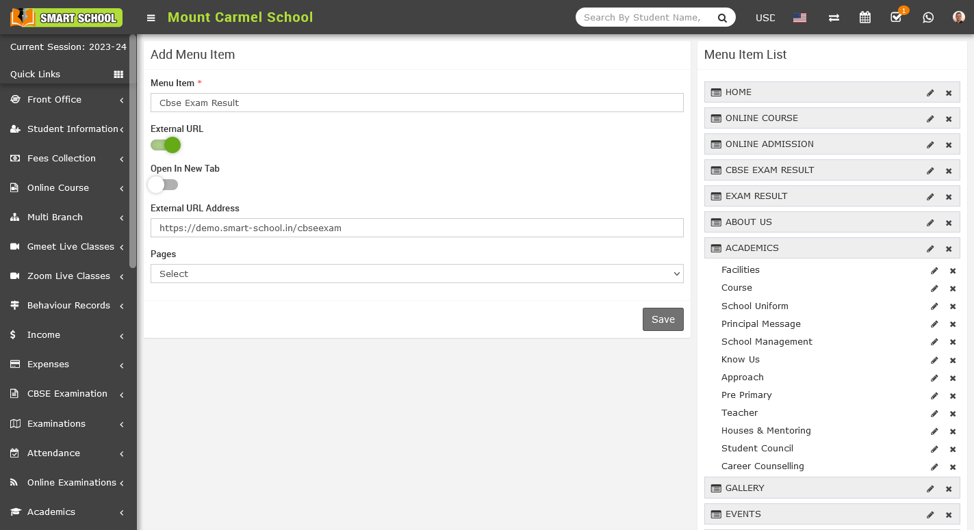 For Example:- In Menu Item enter CBSE Exam result, enable External URL toggle button, disable Open in New Tab, enter External URL Address, Pages drop down don’t select any dropdown then click on the save button.
