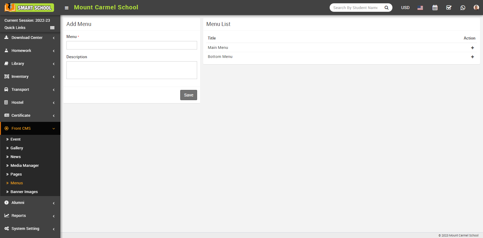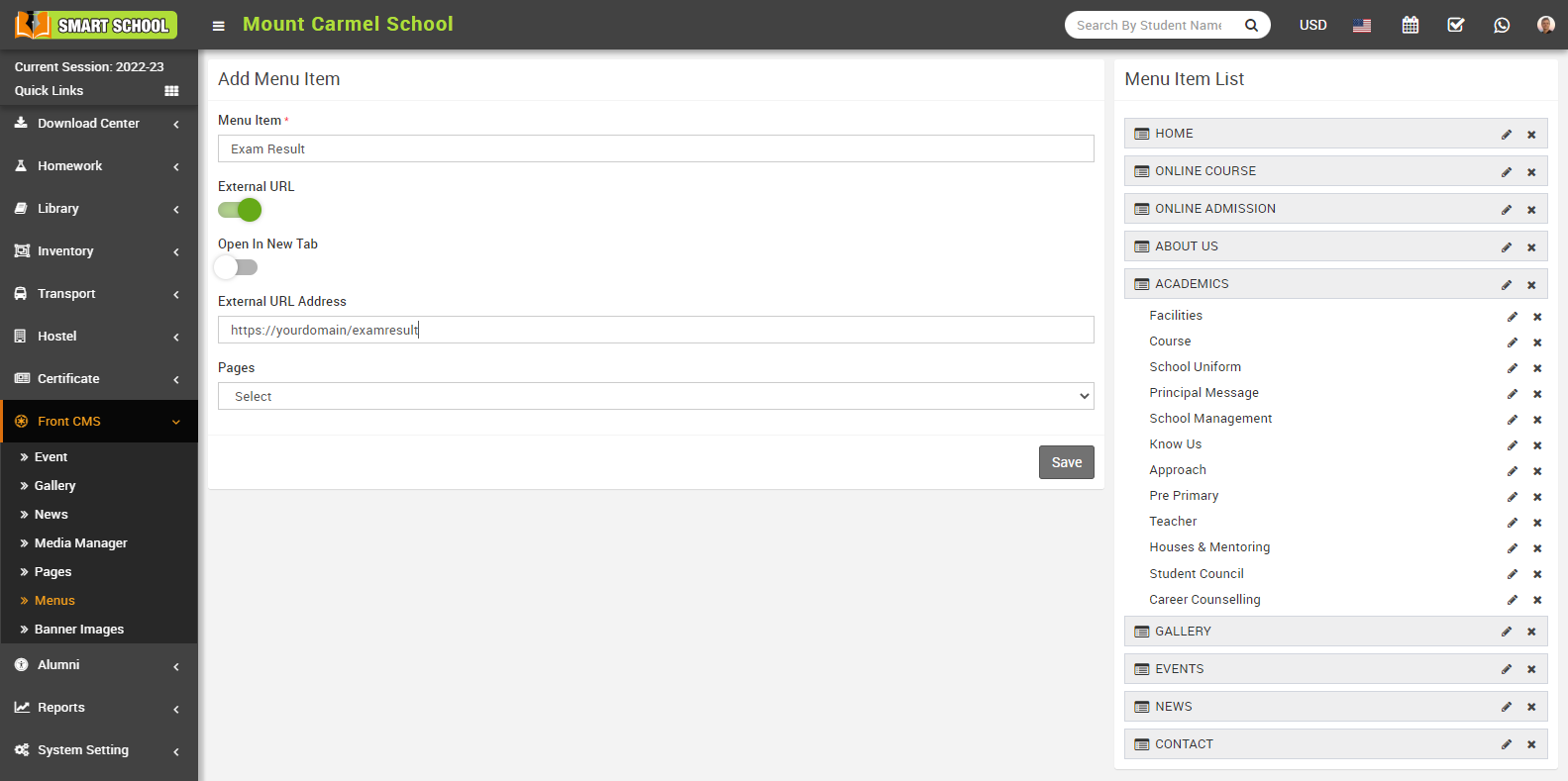 For Example - In Menu Item enter Exam result, enable External URL toggle button, disable Open in New Tab, enter External URL Address, Pages drop down don’t select any dropdown then click on the save button.