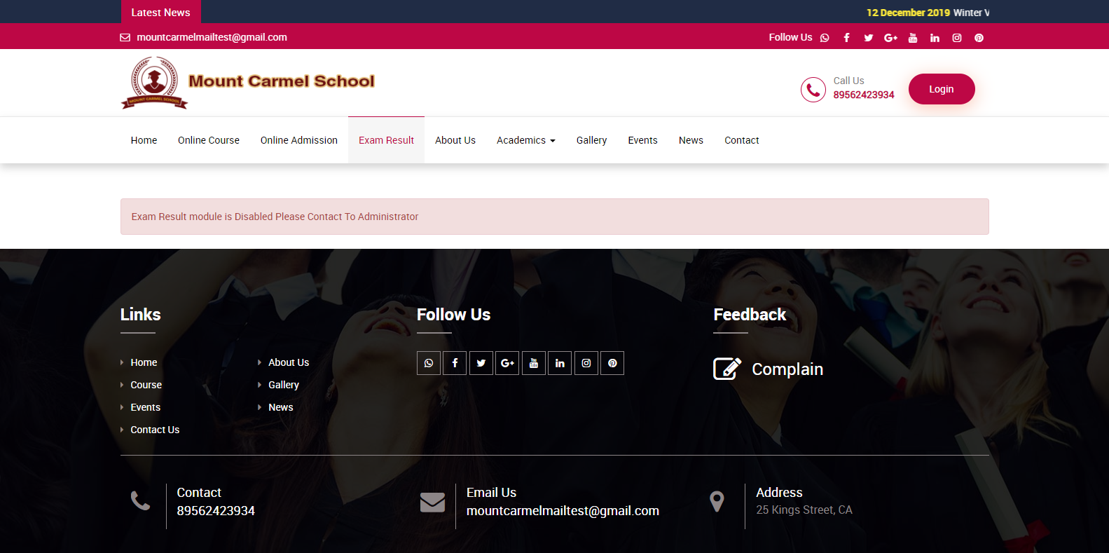When you visit Smart School's front page, when you click over the exam result module you will notice the message as “Exam Result module is Disabled Please Contact To Administrator".
