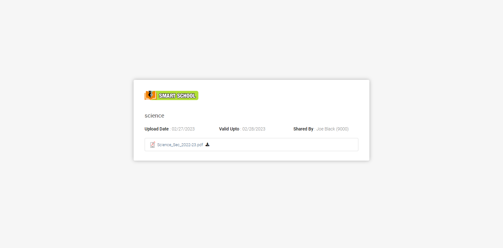 Clicking on the View icon will open the Shared Contents model. In this model, you can view details of the shared content such as the Upload Date, Valid Upto, Share Date, Shared By, send to, Description, and Shared Group/Users. In the Attachments section, you can view or download the attachment file by clicking on it, depending on the file type.