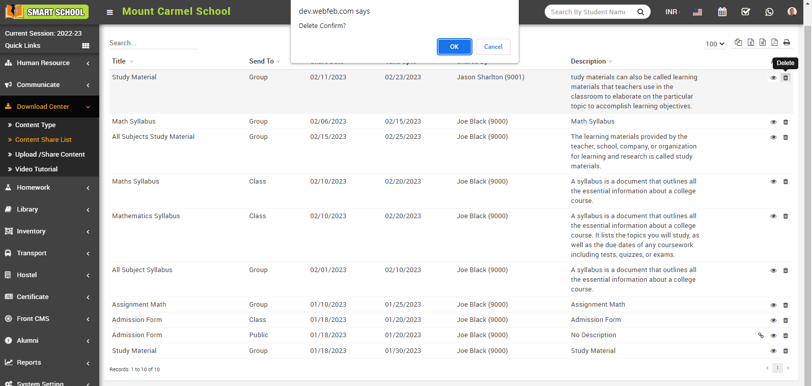 To Delete a content detail from the shared content list, simply click on the Delete icon located in the Action column. This will open a Confirmation model. Click the "OK" button to confirm the delete of the content details from the content share list.