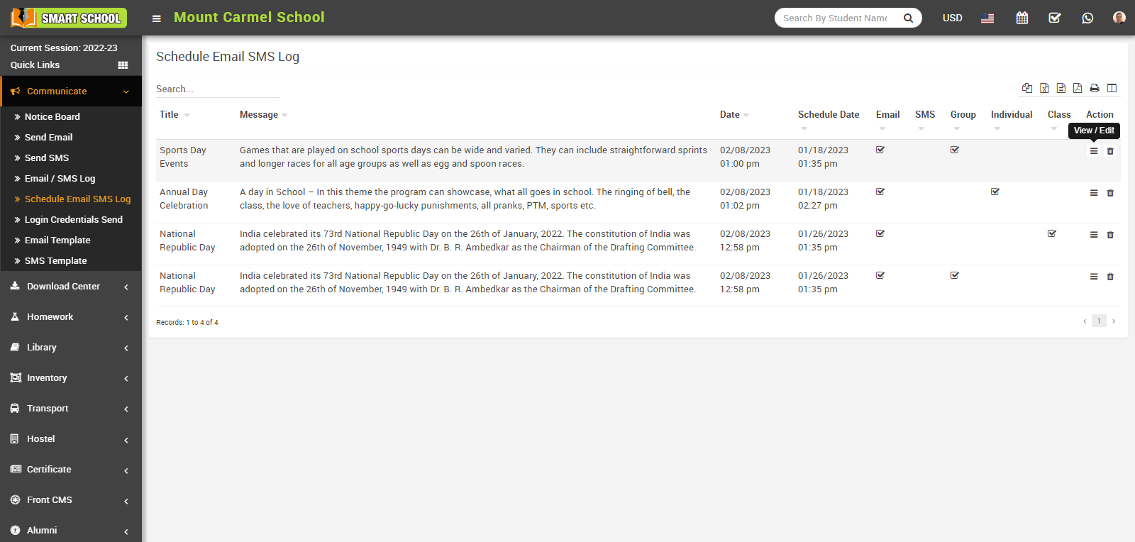 In the Action column, you can view, edit, or delete the scheduled email and SMS logs. Click on the "View" option in the action column to view or edit.