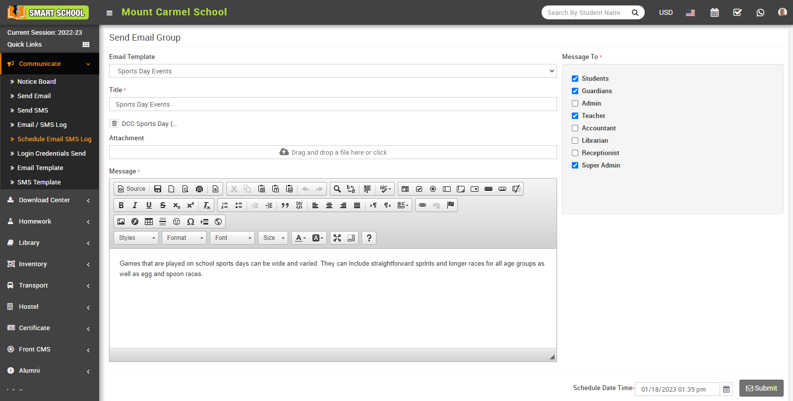 A schedule email, SMS log, or log of scheduled messages refers to a record or list of messages that have been scheduled to be sent via email or SMS (Short Message Service) at a specific time or date. This log helps to track and manage scheduled messages, allowing administrators or marketers to see when messages were sent, when they are scheduled to be sent, and whether they were delivered successfully. The log may also include additional information such as recipient list, message content, and status updates, making it a valuable tool for tracking the success of communication campaigns and ensuring that messages are sent to the right people at the right time.