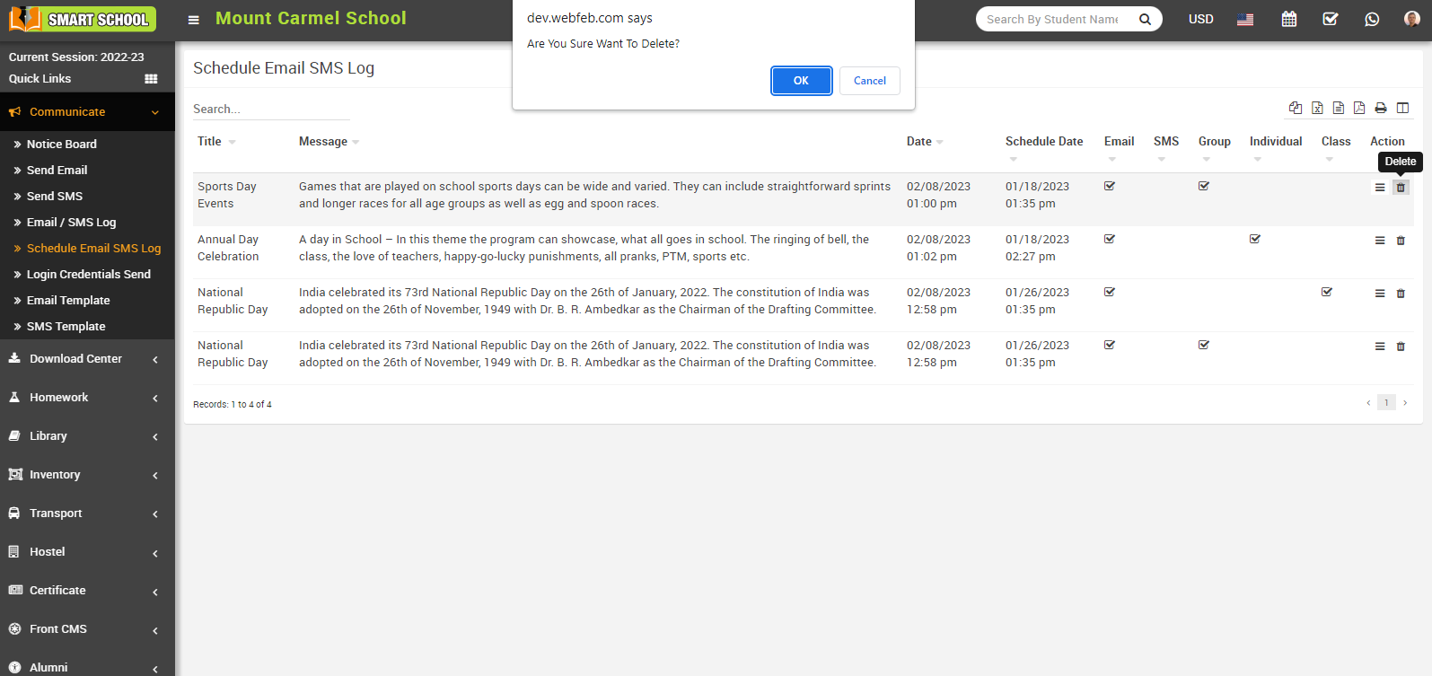 To Delete them, simply click on the Delete icon in the Action column, and your schedule email sms will be successfully deleted.