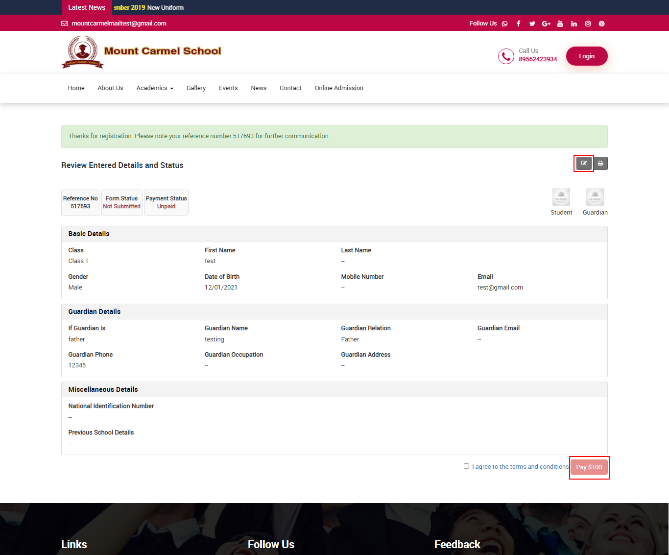 After submit Online Admission form review Online Admission form page will show where edit and make payment button are available. Please make sure that you have not logged in from admin panel same time from same browser while filling Online Admission form otherwise edit form and pay button will not show.